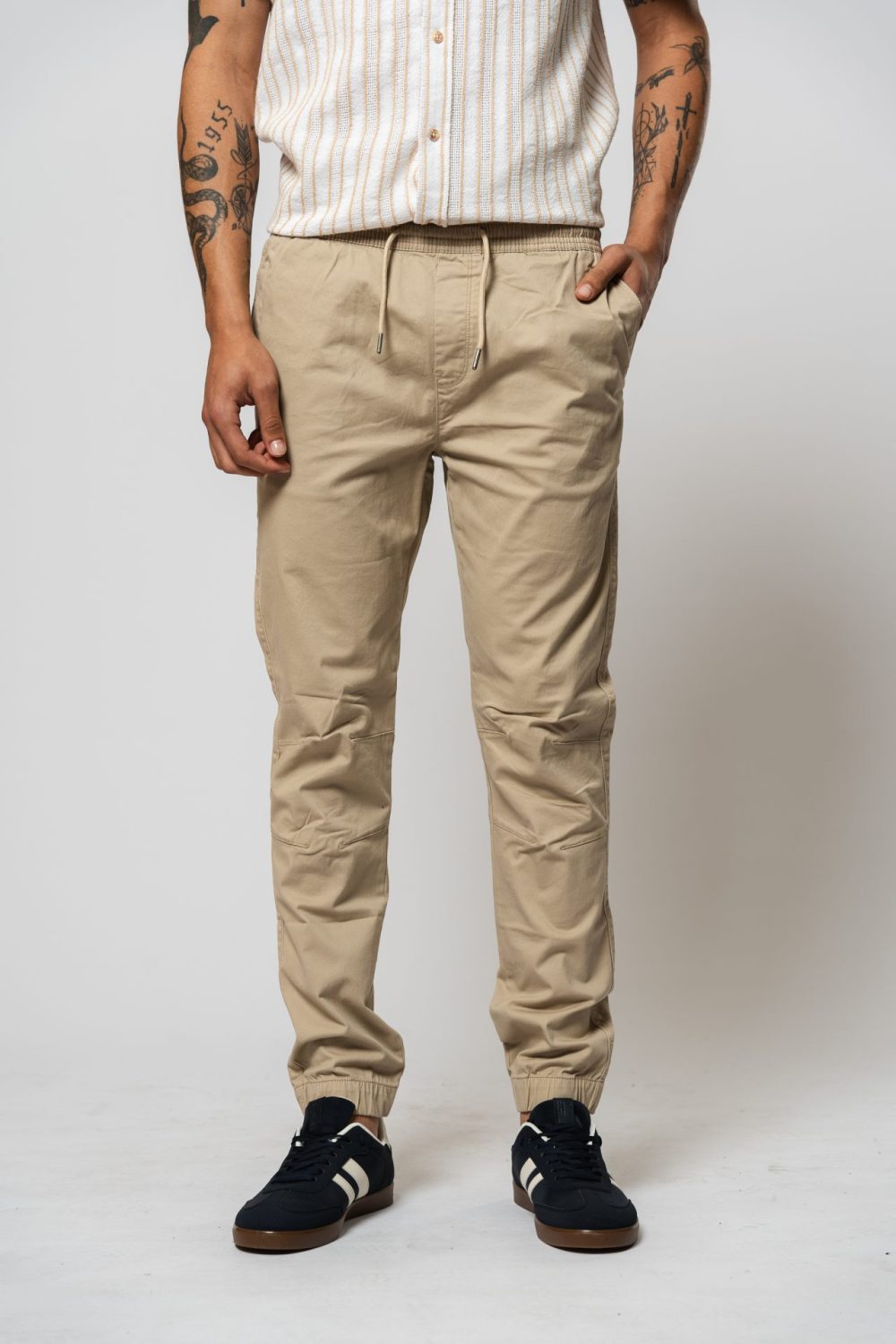 Pantalón jogger de gabardina para hombre (97 % algodón, 3 % spandex) en color Beige, combina funcionalidad y confort. Disponible en locales Vernier de todo Uruguay y en tienda online con garantía de calidad Vernier.